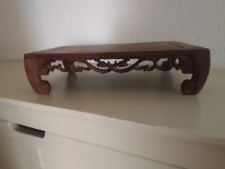 Base de madera para exhibir bonsáis o figuras. - Diseño con patas curvas y ornamentación tallada. - medidas exteriores 31 x 16'5 x 7'5 cm