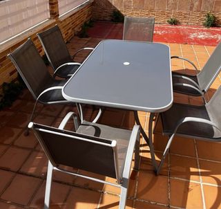Conjunto exterior de jardín compuesto por una mesa (122x8) y seis sillas con reposabrazos. Se encuentran en perfectas condiciones, casi nuevo porque no ha tenido casi uso. Listas para disfrutarlas al aire libre. Se puede ver sin compromiso. Recogida en Aranjuez