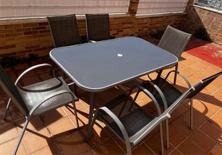 Conjunto de mesa y cuatro sillas para tu jardín o terraza. Ideal para disfrutar del aire libre. - Mesa con sobre de cristal. Tejido sillones textilene, estructura de acero y vidrio templadoCompuesto por;1 Mesa ; medidas; 150cmx90cmx72cm4 Sillones posiciones ; medidas;57cm x 67cm x 44/104cm (Peso maximo persona/ sillón: 110KG) Le falta el parasol