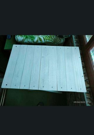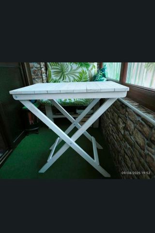 Mesa de jardín plegable de madera, ideal para espacios pequeños. Es de color blanco y tiene un diseño sencillo y elegante. - Perfecta para balcones o terrazas. - Fácil de plegar y guardar. - nueva Medidas;. 65 de alto x 60 de largo y 40 de ancho.