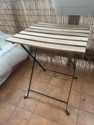 Mesa auxiliar plegable de IKEA, ideal para balcones o espacios pequeños. Se encuentra en buen estado, con algunas señales normales de uso. - Perfecta para disfrutar de un café al aire libre. - Diseño ligero y fácil de plegar para un cómodo almacenamiento.