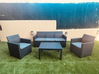 Conjunto de mobiliario de exterior. - Sofá de 2 plazas. - Dos sillones individuales. - Mesa auxiliar con función de almacenaje.