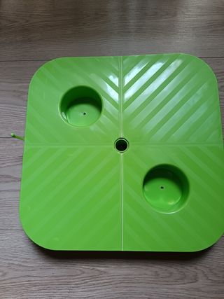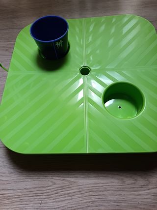 Mesa plegable para sombrilla, ideal para playa. Es de color verde y tiene superficie antideslizante y dos huecos para colocar vasos o botes y evitar su vuelco. Ligera y fácil de transportar. Medidas abierta: 38 x 38 cm. El diámetro máximo del agujero para el palo de sombrilla es de 2,5 cm aprox. Se puede regular con la rueda para ajustar a palos más finos. PRECIO NO NEGOCIABLE SALVO LOTES.