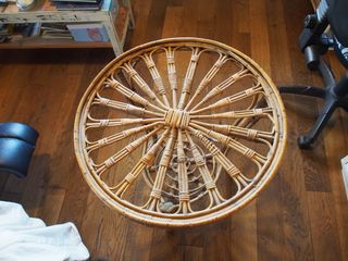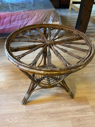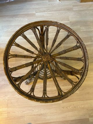 Elegante mesa auxiliar redonda con un diseño único inspirado en una rueda. - Fabricada en mimbre y ratán. - Tonos naturales en beige y marrón. No tiene cristal. Está bastante usada tal y como se ve en las fotos. Medidas en las fotos.