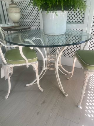 mesapara terraza o jardín con un diseño elegante. - Mesa redonda con sobre de cristal. - Estructura de hierro -No hago envios