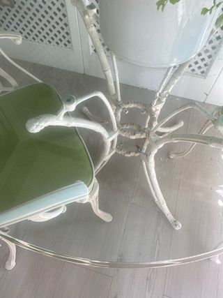 Mesa bistró de hierro y dos sillas plegables vintage. Ideal para espacios pequeños o para añadir un toque retro. Para jardín o exteriores o cualquier rincón de la casa. Las sillas son cómodas y de buen tamaño. Mesa bistró 140 € Sillas 80 € cada una. - Mesa redonda con tablero de cristal. - Sillas con estructura metálica y asiento de malla. - Diseño plegable para fácil almacenamiento. Vintage, retro, oxidado, mesa café, mesa auxiliar, mesita, metal, hierro, forja, atrezzo, diseño, lampara , 60, 70, 80