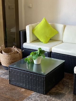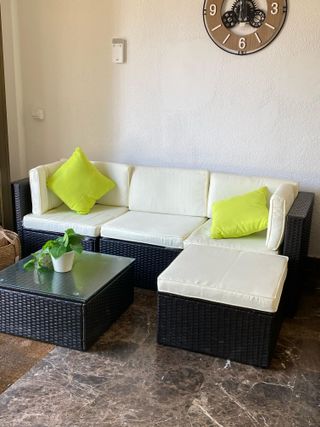 Muebles de jardín nuevos a estrenar. Se venden 2 sillones y un sofá de mimbre color negro con cojines beige. Incluye también una mesa de centro. Ideales para disfrutar del buen tiempo. - Estructura resistente y elegante. - Cojines cómodos y desenfundables. - Perfectos para terrazas y jardines.