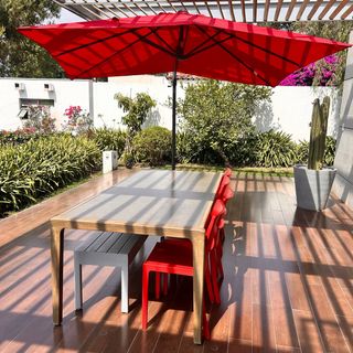 Mesa versátil, ideal tanto para exteriores como para interiores. Su diseño combina materiales duraderos y un acabado atractivo. - Estructura principal de madera. - Superficie de marmol resistente. Regalo con la compra de la mesa una sombrilla marca Interhome color roja con brazo de brazo con movimiento 360 grados de manera horizontal y dispositivo manual para movimiento tambie vertical. Medida de la sombrilla: 3 m x 2,5 m