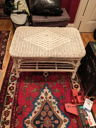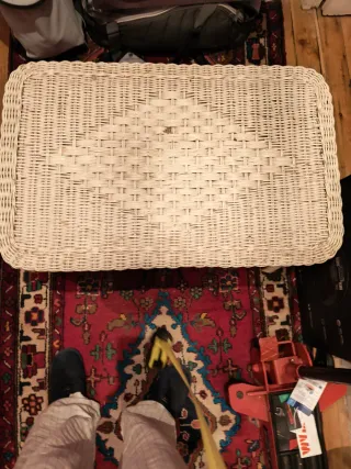 Mesa auxiliar de mimbre con un diseño tejido. - Materiales: mimbre y madera. - Color: blanco.