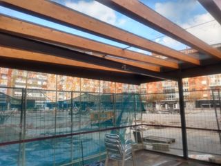 Terraza de paredes de cristal, dos de las cuales se pueden mover y desplazar para abrir los lados. Techo y suelo de madera. Espacio para 11 mesas. Las dimensiones son 5,20 metros de ancho × 7,20 de largo. Tiene puertas correderas. Para más información, no duden en preguntar. Precio negociable.