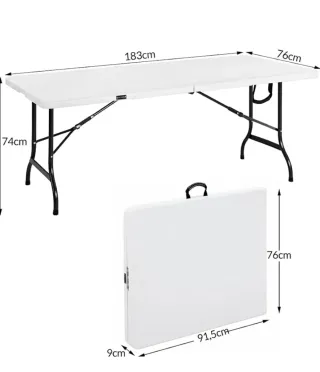 Mesa plegable de gran tamaño, ideal para eventos o uso exterior. Se pliega fácilmente para su almacenamiento. - Medidas desplegada: 183cm x 74cm x 76cm. - Medidas plegada: 91,5cm x 76cm x 9cm. - Patas metálicas plegables.