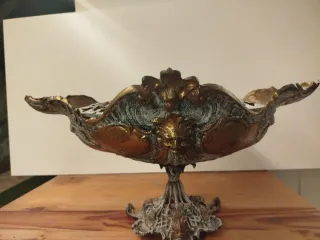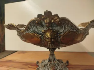 Elegante jardinera o centro de mesa con un diseño intrincado. - Fabricada en bronce con acabado dorado y blanco. - Detalle de rostro en el frente. - Base ornamentada.