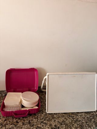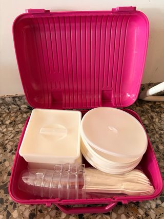 Práctico pack de picnic que incluye una maleta organizadora y una mesa plegable. - Maleta de color rosa con compartimentos interiores. - Mesa de color blanco. - Fabricado en plástico.