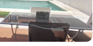 Mesa de aluminio blanco y cristal color nude con orificio para sombrilla . Regalo 4 sillas plegables a juego( 2 sillas están descosidas del asiento,las sillas de la foto es una sugerencia pues son de Ikea,a 10 euros y combinan perfectamente con la mesa).Sirven para exterior . Perfecto estado d la mesa,sin arañazos. Se puede ver.