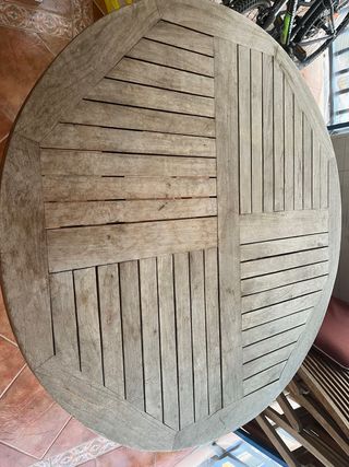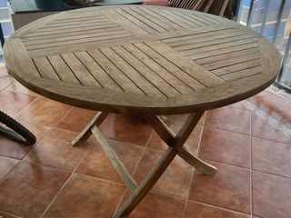 Preciosa mesa de jardín de madera de teca, redonda y con un diámetro de 120cm. Ideal para disfrutar al aire libre. - Plegable para facilitar su almacenamiento. - Diseño clásico y elegante. - Se encuentra en buen estado, con señales normales de uso. - Incluido 4 sullas de madera plegables