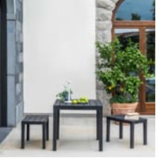 Conjunto de mesa y dos taburetes para jardín. La mesa y los taburetes es de resina tratada para el exterior de color gris antracita. Son ideales para disfrutar del aire libre. - Medidas de la mesa: 78cm x 78cm x 72cm (ancho x largo x alto) - Incluye mesa y dos taburetes. En su caja original sin estrenar, tengo dos conjuntos