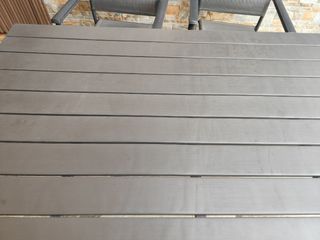 Mesa de jardín de color gris, fabricada con una combinación de metal y plástico. Se encuentra en buen estado,aunque ha salido defectuosa,tiene como manchas más oscuras,está mesa se recogería en ciudad real ,de ahí su precio. - Diseño de líneas rectas. - Superficie lisa.