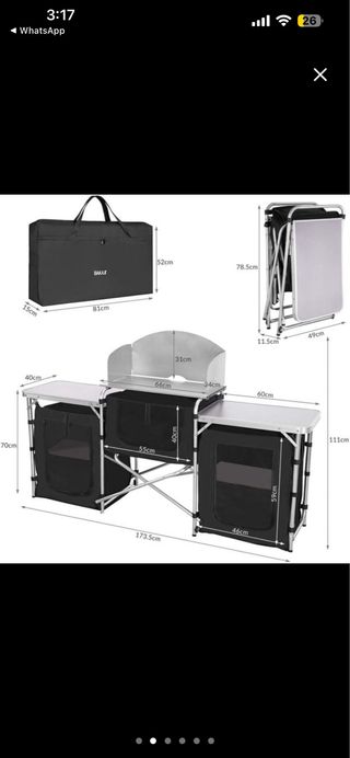Mesa de camping plegable de la marca BAKAT, ideal para actividades al aire libre. Se pliega fácilmente para su transporte y almacenamiento. - Dimensiones plegada: 81cm x 15cm x 52cm. - Dimensiones desplegada: 173.5cm x 60cm x 111cm. - Incluye bolsa de transporte.