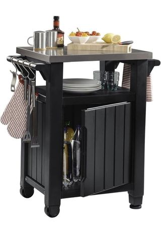 Con armario de almacenamiento y parte superior de acero inoxidable. MarcaKeter MaterialPlástico ColorGrafitegray Función especialRobusto Número de estantes2 Usos recomendados para el productoAl aire libre Mide 53 pulgadas de largo x 20.4 pulgadas de ancho x 35.4 pulgadas de alto. Mide 53.3 pulgadas de largo x 20.3 pulgadas de ancho x 35.4 pulgadas de alto. Capacidad de almacenamiento de 295 litros: 205 litros en el interior y 90 litros en el exterior. Resina duradera y resistente a la intemperie con una atractiva textura de madera natural. Parte superior de acero inoxidable 430 duradero