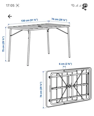 Mesa de jardín modelo Torparo de Ikea, usado solo 3 veces. Su diseño es práctico y funcional para exteriores. - Medidas: 130 cm (largo) x 75 cm (alto) x 74 cm (ancho). - Plegable para un fácil almacenamiento. - Estructura metálica resistente.