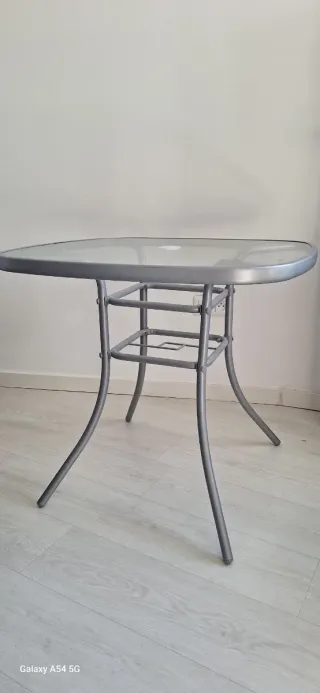 Mesa redonda con superficie de cristal y estructura metálica, ideal para exteriores/o interiores - Diseño moderno y elegante. - Patas curvas para mayor estabilidad.