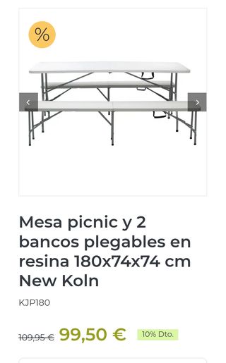 Pack de mesa y 2 bancos plegables New Koln con tablero de polietileno con protección UV y estructura de acero con recubrimiento anticorrosión, apto para uso interior y exterior. Cada pieza se pliega tipo maleta con asa lateral y sistema de bloqueo, facilitando transporte y almacenamiento. Capacidad: mesa para 6-8 comensales, cada banco hasta 4 personas. Materiales resistentes al clima y de fácil limpieza, solo trapo húmedo. Dimensiones totales 180 x 74 x 74 cm, peso 24 kg. Ideal para jardín, picnic, playa o uso auxiliar en casa. Incluye un bulto de 26,25 kg, medidas 16x94x76 cm. Diseño práctico, seguro y versátil, perfecto par...