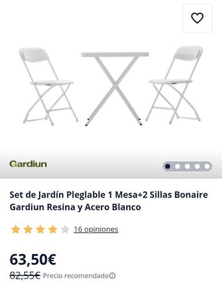 Conjunto plegable de jardín Gardiun formado por 1 mesa y 2 sillas, ligero, resistente y fácil de transportar, ideal para terraza, balcón, camping o excursiones. Estructura de acero pintado en blanco y superficie de polietileno, combina con cualquier estilo. La mesa mide 68,6×68,6×74,3 cm y las sillas 43,1×45×80,33 cm. Se pliega rápidamente para ahorrar espacio y facilitar su almacenamiento. Set versátil para interior o exterior, perfecto para comidas al aire libre o momentos de relax.