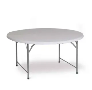 Mesa Gardiun KJM120R. Tiene desperfecto estético - una pequeña abolladura en una esquina del plástico (marcada con círculo rojo en foto), no afecta funcionamiento. Mesa plegable, diámetro 122 cm, altura 74 cm, superficie HDPE 3,5 cm, estructura de acero galvanizado Ø25 mm, capacidad 150 kg, peso 13,5 kg, color blanco con patas grises, resistente a rayos UV y certificada EN581. Ideal interior/exterior, fácil de transportar y limpiar. Compacta y robusta, perfecta para picnic, terraza o eventos.