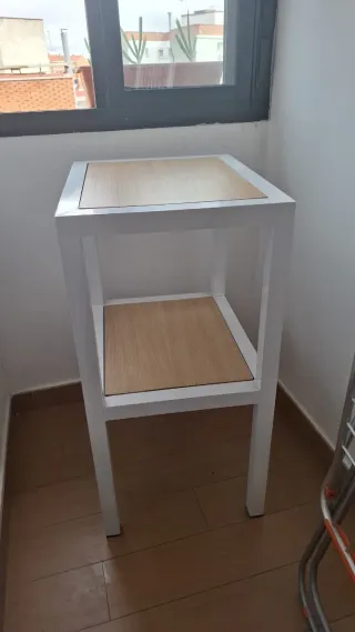 Poco uso Elegante mesa auxiliar con estructura de alumnio blanca y baldas de madera. Medidas 55 cm horizontal 45 cm fondo 91 cm altura - Diseño moderno y funcional. - Ideal para cualquier rincón del hogar.