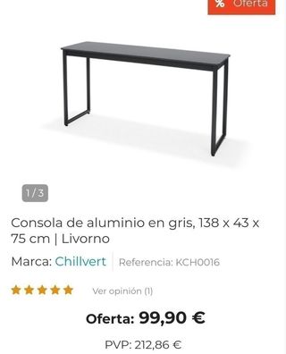 Colócala en tu jardín o terraza siempre y cuando no la expongas a la intemperie. Características: - Medidas: 138 x 43 x 75 cm. - Peso: 13,4 kg. - Color: Tablero gris oscuro y la estructura gris antracita. - Material: Aluminio, madera de Eucalipto y resina. - Colección: Livorno. - Marca: Chillvert. - Especificaciones: - Consola gris oscura para exteriores e interiores. - El tablero es resistente a los rayos UV, reciclable, ecológico y respetuoso con el medio ambiente.