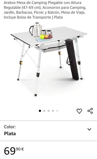 Arebos Mesa de Camping Plegable con Altura Regulable (47-69 cm), Accesorios para Camping, Jardín, Barbacoa, Picnic y Balcón, Mesa de Viaje, Incluye Bolsa de Transporte | Plata Dimensiones del producto90f. x 69an. x 51,5al. centímetros Peso del producto3,65 Kilogramos Recomendación de peso máximo30 Kilogramos Material del marcoAluminio ColorPlata [Un compañero compacto y estable para las aventuras al aire libre] La mesa de camping plegable con estructura de aluminio es ideal para acampar, viajar o celebrar fiestas en el jardín. Gracias a su construcción robusta y a su triple refuerzo, ofrece la máxima estabilidad en cualquier superfi
