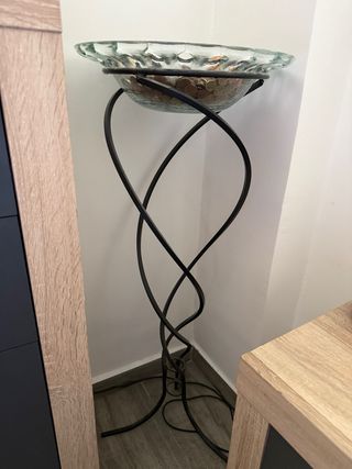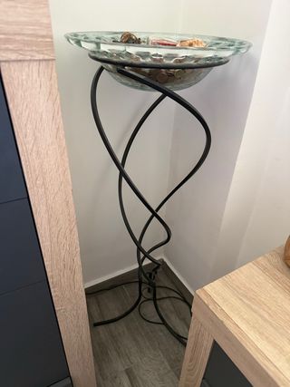 Elegante macetero con una base de acero forjado y un cuenco de cristal. - Base de acero forjado con diseño curvo. - Cuenco de cristal con borde texturizado. - Ideal para plantas o como centro de mesa decorativo.