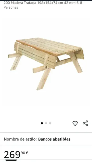 Mesa picnic fabricada con madera de pino macizo FSC de 42 mm de espesor. Con 2 bancos abatibles. Para 6-8 comensales. Con tratamiento autoclave tipo III. Color natural y diseño funcional: perfecto para ambientes exteriores.Ideas de uso: una mesa de picnic perfecta como mobiliario de exterior en jardines, patios, parques o merenderos. Recomendamos un espacio de 210×175 cm para su óptima instalación.Peso 50-80 kg Dimensiones 198 × 154 × 74 cm Marca Gardiun Alto total (cm) 74 Ancho total (cm) 154 Largo total (cm) 198 Peso (kg) 50-80 Material Madera Color Madera Uso Exterior Espesor panel madera (mm) 42 mm