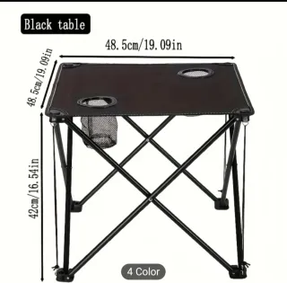Mesa plegable de color negro, ideal para actividades al aire libre. - Dimensiones: 48.5cm x 48.5cm x 42cm. - Con dos portavasos integrados. - Incluye una bolsa de malla para almacenamiento.