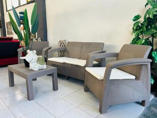 Precioso y económico conjunto de jardín, compuesto por: Dos sillones de una plaza. Un sillón de dos plazas. Una mesa de centro. Ideal para que puedas disfrutar de terrazas y jardines al aire libre, lleva incorporado sus correspondientes cojines. ✅Entrega a domicilio. ✅Pago contra reembolso. ✅Consulta Precio del envío.