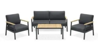 Conjunto Jardín PELEN – Leroy Merlin compuesto por sofá 2 plazas + 2 sillones + mesa + 8 cojines 🔷Venta completa, precio ajustado para venta rápida 🔷Materiales y calidad: Estructura de aluminio negro: ligera, resistente e inoxidable Madera maciza de teca en mesa y reposabrazos (certificación FSC) Cojines gris antracita de poliéster, aptos para exterior y muy cómodos 🔷Medidas: Sofá: 160 × 72 × 82 cm (ancho × alto × fondo) Sillones: 71 × 72 × 82 cm Mesa: 99 × 60 × 45 cm (largo × ancho × alto) 📍 Gandía – Listo para usar