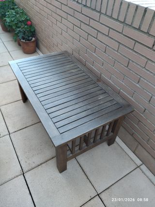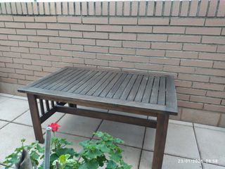 Mesa de madera de teca, perfecta para exteriores. Su diseño es elegante y robusto. Esta sin usar. Se suele vender en tienda entre 500 y 700 eur , segun si es epoca de rebajas , pero a menos no. Es buen material, apto exteriores y requeire poco mantenimiento . - Material: Madera de teca. - Color: Marrón natural.
