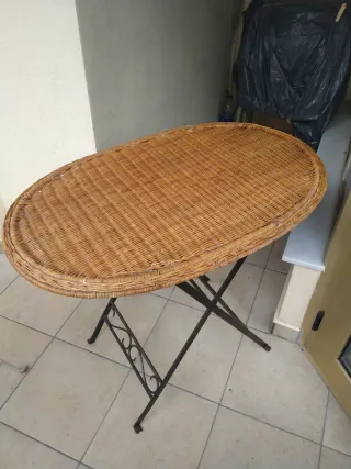 Elegante mesa con sobre ovalado de mimbre y estructura metálica. - Diseño de mimbre tejido. - Base de metal con detalles decorativos.
