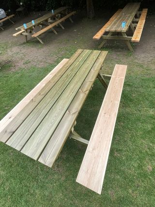 Mesas de picnic de madera para 10 personas nuevas sin varnizar y desmontadas . Ideales para jardín o terraza. - mesas de madera incluidas. - Listas para usar.