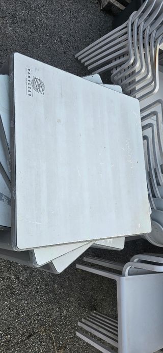 Se venden mesas de la marca Mahou. Son de color gris y blanco. - Ideales para hostelería. - Fáciles de plegar y guardar. - Resistentes y duraderas.