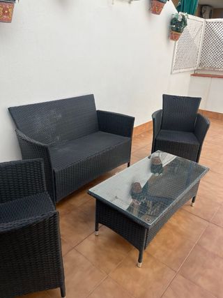 Conjunto de muebles de exterior ideal para terrazas o patios. - Sofá de dos plazas. - Dos sillones individuales. - Mesa de centro con tapa de cristal. Las dos sillas habria que arreglarlas un poco , NO ENVIOS