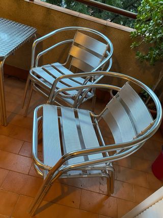 Conjunto de sillas y mesa apilables, ideales para terrazas. Fabricadas en aluminio para mayor durabilidad у ligereza. - Diseño apilable para optimizar espacio. - Estructura robusta de aluminio. - Superficie de mesa metálica. Solo recogida