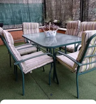 Set de muebles de forja para jardin. mesa con cristal y 4 sillas. Se incluyen cojines. Es super resistente tanto al sol como a la lluvia. Se incluyen cojines para las sillas.