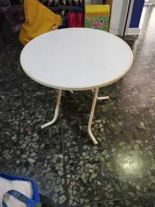 Mesa redonda plegable, práctica y fácil de guardar. - Tablero de plástico. - Patas de metal.