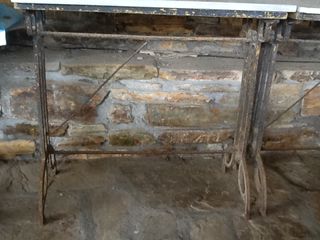 • MESA DE HIERRO Y MÁRMOL. Mesa con los pies de hierro y la tapa de mármol, de mediados del siglo pasado, muy utilizada en las grandes cafeterías. • ESTADO: Se encuentra en buen estado de conservación, si bien necesita una restauración, consistente en lijar la pintura vieja de las patas de hierro y volver a pintarlas. • Si desea ver esta pieza personalmente se puede concertar una cita presencial en la ciudad de Lugo. • Por cuestiones de tamaño, se entrega en mano, en Lugo capital. Se encuentra en planta baja. Posibilidad de envío, siempre que sea gestionado completamente por el comprador.