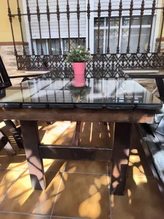 Conjunto de mesa y sillas perfecto para tu jardín o porche. Las sillas son reclinables para mayor comodidad. Ha estado en zona techada y protegido - Mesa con superficie de cristal. 150*70cm - Sillas reclinables varias posiciones.