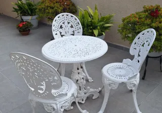 Conjunto de mesa y tres sillas de jardín de hierro forjado con un diseño elegante y detallado, perfecto para exteriores. - Conjunto en perfecto estado, muy bien conservado. - Acabado en color blanco. - Estructura de metal resistente. - Diseño ornamentado en respaldo y patas.