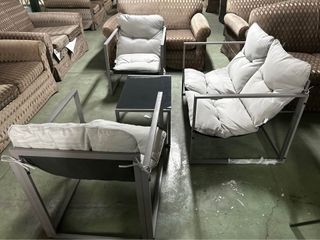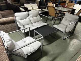 Conjunto de mobiliario de exterior con un diseño moderno y confortable. - Estructura metálica. - Cojines de tela. - Mesa con superficie de cristal.