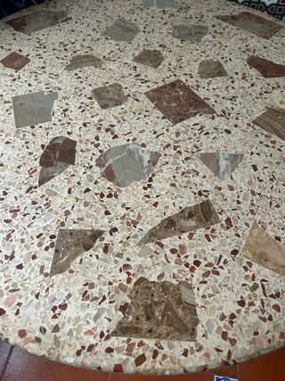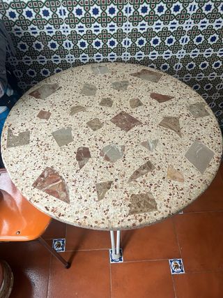 Mesa redonda con superficie de granito y base de hierro en color blanco . Perfecta para exteriores. - Diámetro de 80cm. - Combinación de colores beige, marrones y multicolor. La superficie de granito esta en perfectas condiciones. Las patas estan muy bien, pero con una mano de pintura quedarian perfectas. La entrega en mano MALAGA CAPITAL (Zona Mercado de Huelin). No disponemos de carretilla para mover la piedra. Se entrega en un primer piso con ascensor. Tambien enviamos a traves de Wallapop. Si quieres ofrecer otro precio, te escuchamos 😊