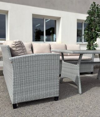 Conjunto de sofá rinconera para exterior, ideal para tu jardín o terraza. Está en perfecto estado, como nuevo. - Estructura de ratán. - Mesa auxiliar con tapa de cristal.
